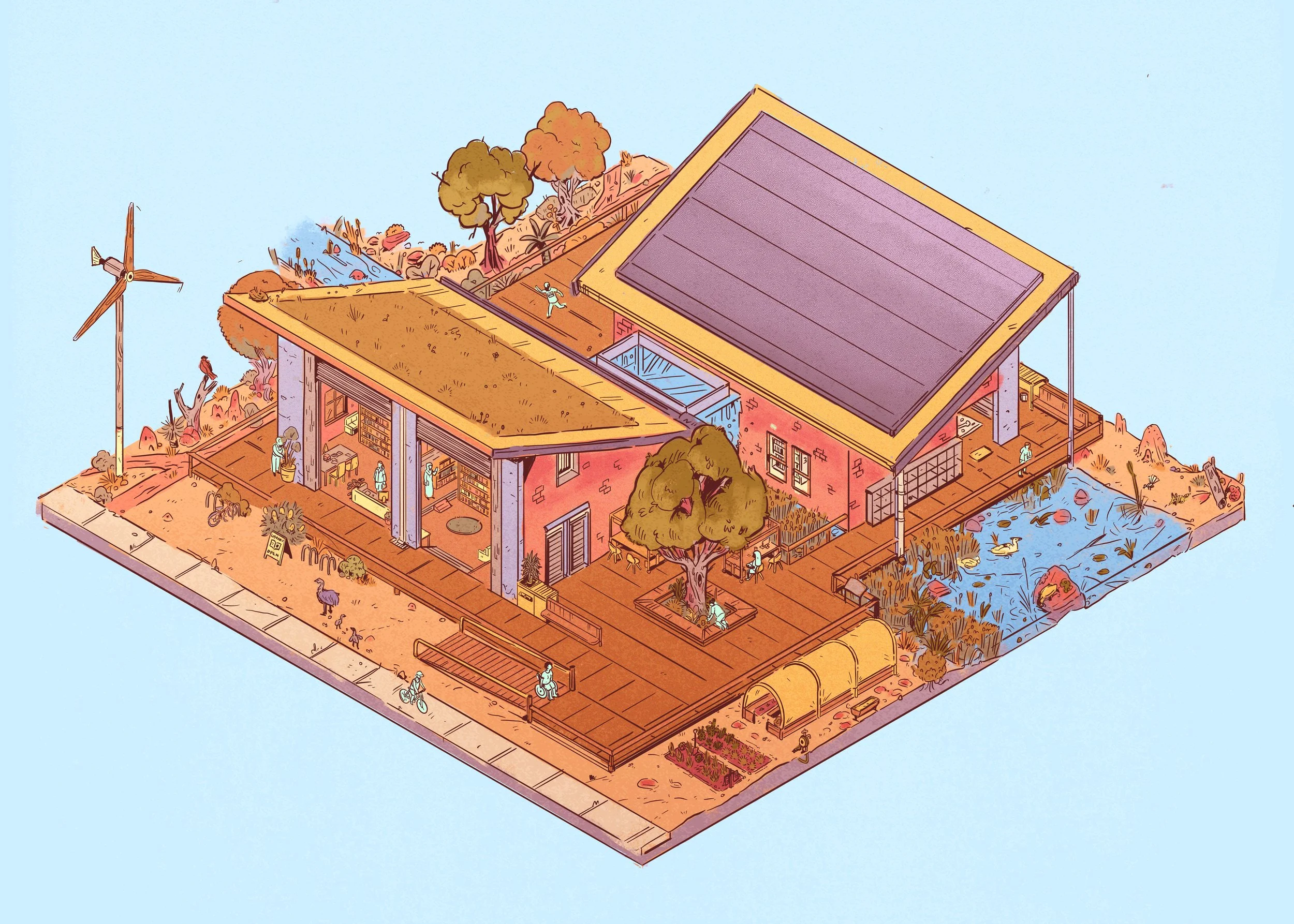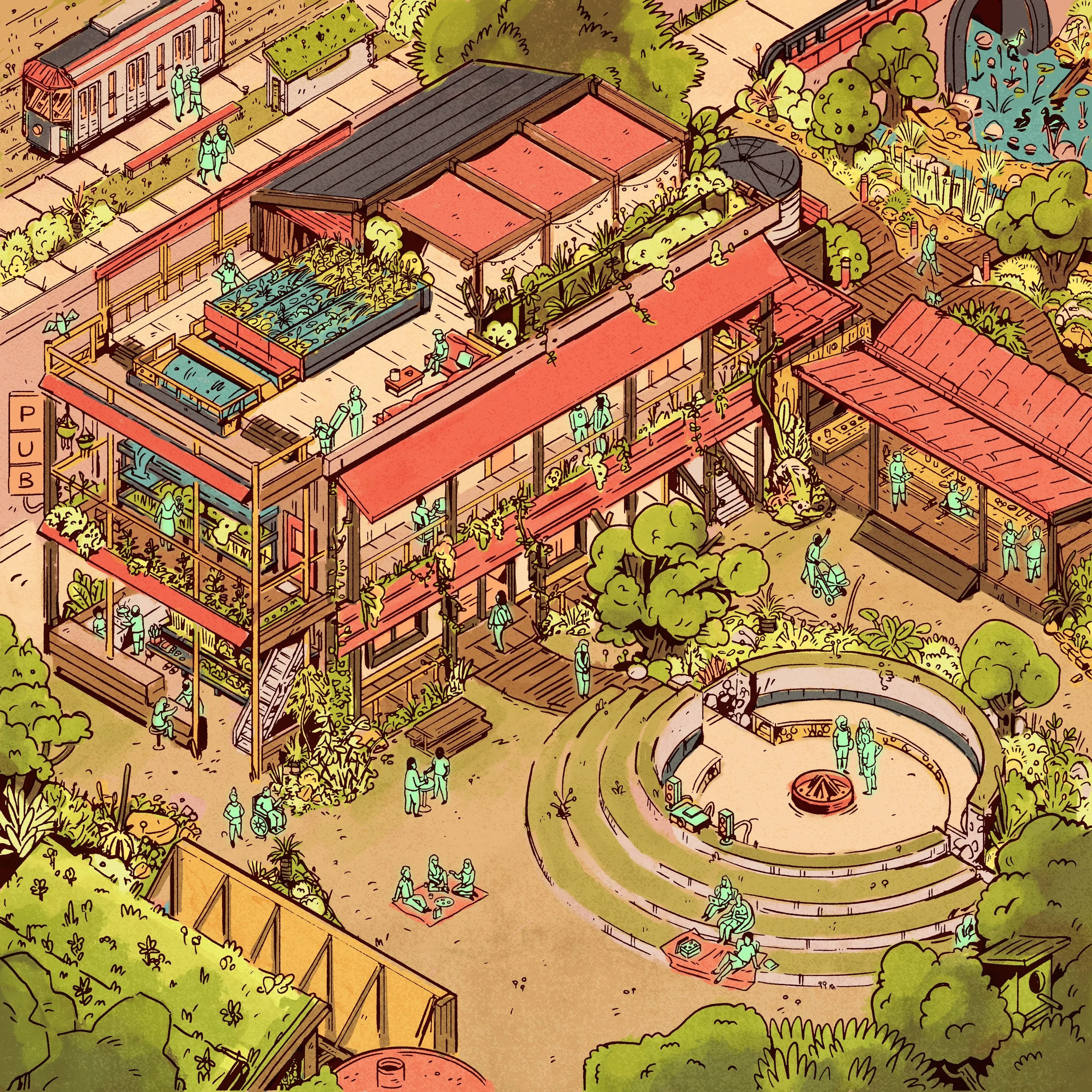 Some work I did for the WA Greens called A Green New Future. Instead of re-imagining the green horizons of the affluent, these tackle the everyday: the local drinking hole, a suburban street, and an outback library.